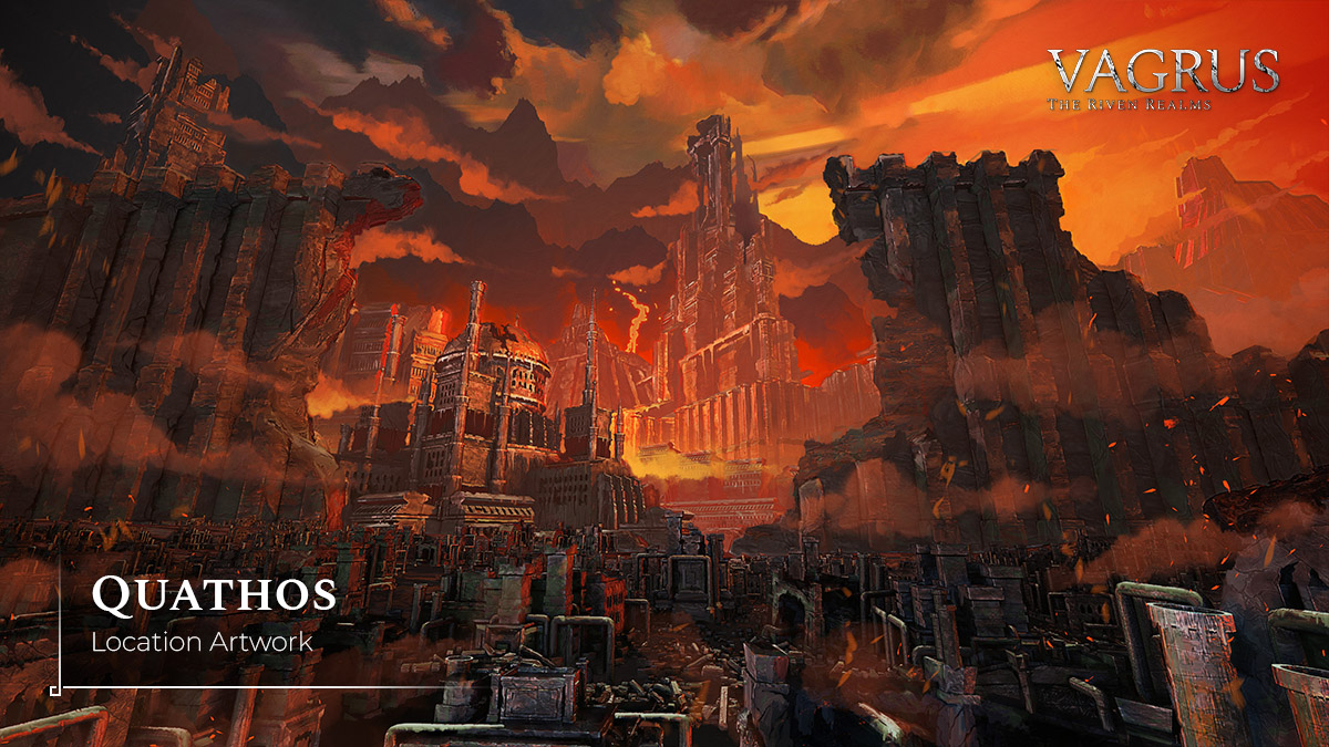 Tragically, even though some of its grandeur survives in the insanely huge, crumbling structures, Quathos is all but gone. In the present day, it is but a ruin of lava and death, a mockery of the greatness of those who came before. The few brave souls who have ventured into Quathos in the Fourth Age have returned to speak of the horrors they witnessed – and the debilitating sadness it inflicted upon them. There even exist those vagri who have dared enter its bounds and pushed past the curtain wall, a point beyond which an unrelenting heat permeates the ruined city’s every crack, crevice, and pore.