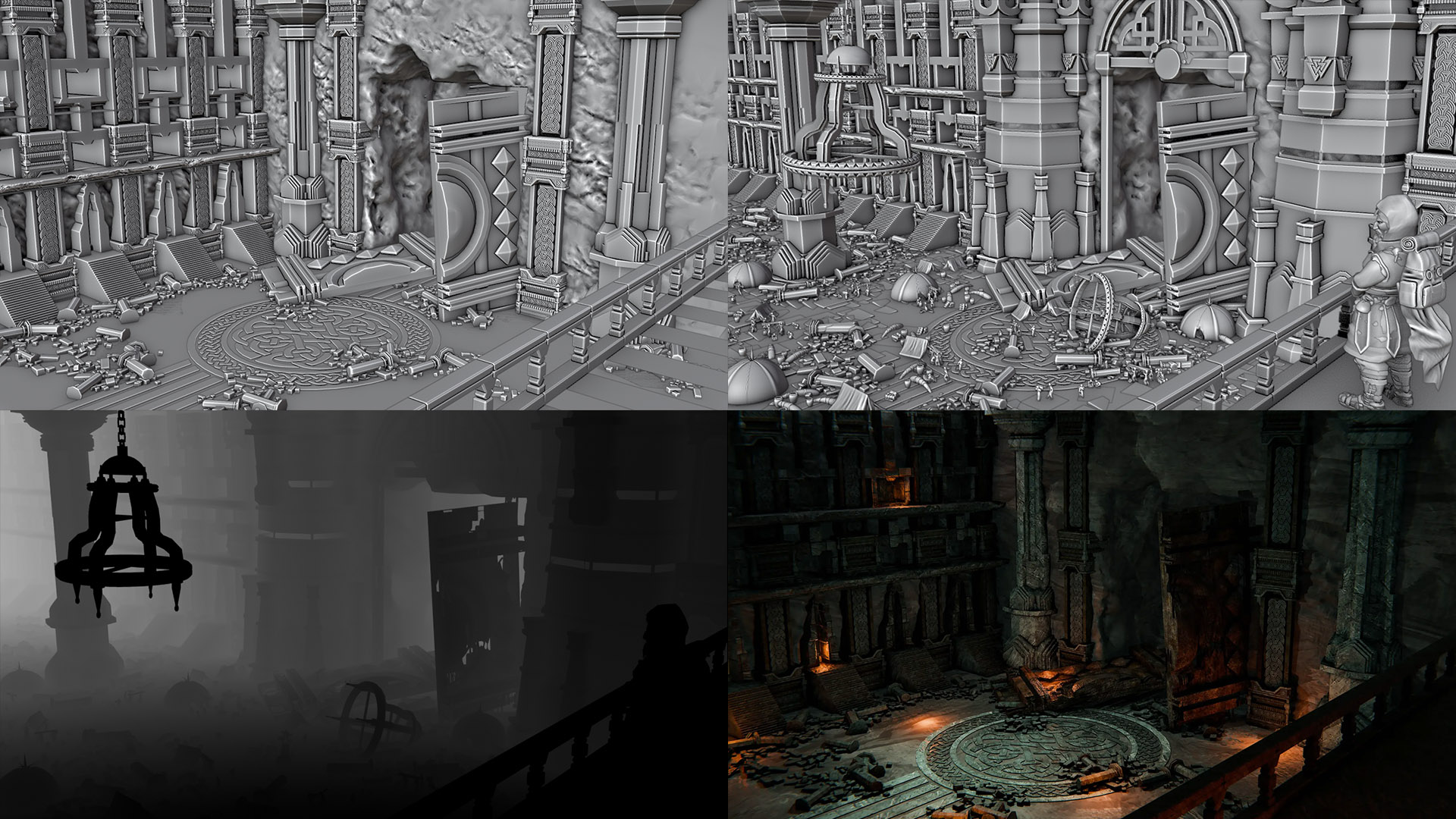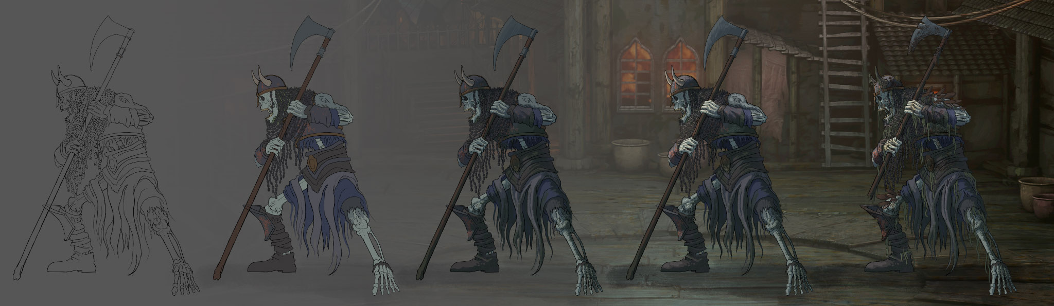 Today, thanks to our artist Bence, most location art pieces are built on 3D blockout foundations. Scenes are assembled from pre-made, modular elements, which are then brought into Photoshop, where various render layers, filters, and manual paintovers are used to achieve the final illustrated, painterly look. This approach is not only more cohesive but also far more efficient – after all, who would want to paint the same skull or environmental detail a hundred times? In any case, the result is that the later content packs (like much of Sunfire and Moonshadow and At the Heart of Ruin) are far denser when it comes to location art – so much so, in fact, that the last expansion has more location illustrations than all previous content combined!